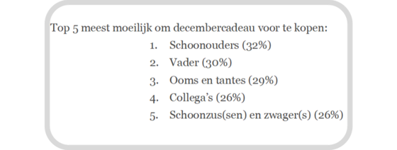 Eén op vier mensen vindt zelf ook dat ze te laat met het inkopen van decembercadeaus beginnen. Voor veel mensen is het kopen van Sinterklaas- en kerstcadeaus namelijk een uitdaging, vooral als het cadeaus voor vader, schoonouders en ooms en tantes betreft. Ruim een derde (35%) van de Nederlanders besteedt er dan ook het liefst zo min mogelijk tijd aan. Tijdens de zoektocht naar passende cadeaus komt ruim de helft van de mensen (57%) terecht bij een voor hen onbekende webshops. Daarvan is een derde onvoorzichtig en checkt niet altijd de beoordelingen op de webshop zelf of externe platformen.