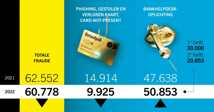 De totale schade daalde in 2021 van 62,5 miljoen naar bijna 61 miljoen euro in 2022. De schade als gevolg van phishing daalde met 67% naar 3,6 miljoen euro. Bij bankhelpdeskoplichting daalde het schadebedrag van 30 miljoen euro in het eerste halfjaar naar 21 miljoen in het tweede halfjaar van 2022. Hierdoor steeg de totale schade licht ten opzichte van 2021 met 6,7 % naar bijna 51 miljoen euro. De schade door verloren of gestolen bankpassen kwam uit op 2,8 miljoen euro en de schade door online fraude met gegevens van creditcards bedroeg 3,6 miljoen euro. In het geval van phishing werd de schade voor bijna 95% in alle gevallen vergoed. Bij bankhelpdeskoplichting was dit percentage 89%.