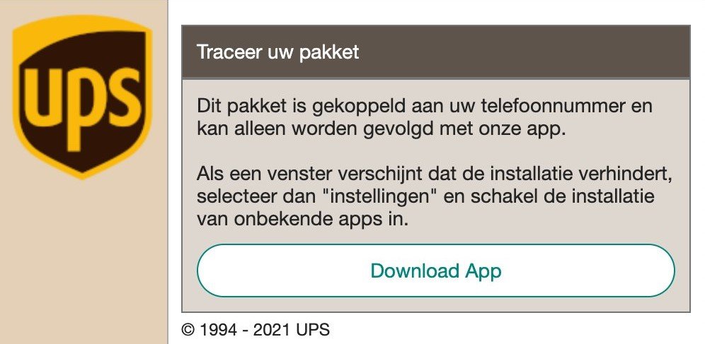 Veel Nederlanders ontvangen de laatste tijd op hun mobiele telefoon een bericht zogenaamd van een pakketdienst of van een winkel. Het bericht probeert de ontvanger wijs te maken dat er een pakket onderweg is en dat de ontvanger een mobiele app moet installeren om de bezorging te regelen en het pakket te volgen.